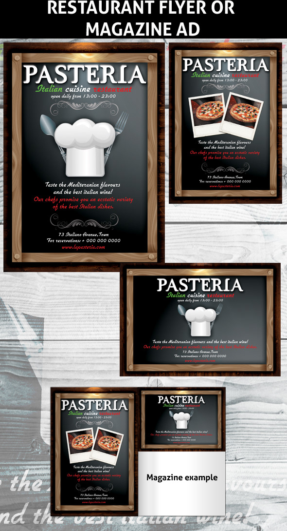 Restaurant Magazine Ads or flyers Template are suitable for any finer dining restaurant, Italian cuisine restaurant or any restaurant that fits the profile. 5 PSD files-4 sizes (A4,A5,5.5×8.5 and 8.5×11inch) including bleeds and guides CMYK Print ready-300 DPI EVERYTHING INCLUDED !PICTURE NOT INCLUDED IS FOR PREVIEW PURPOSES ONLY !